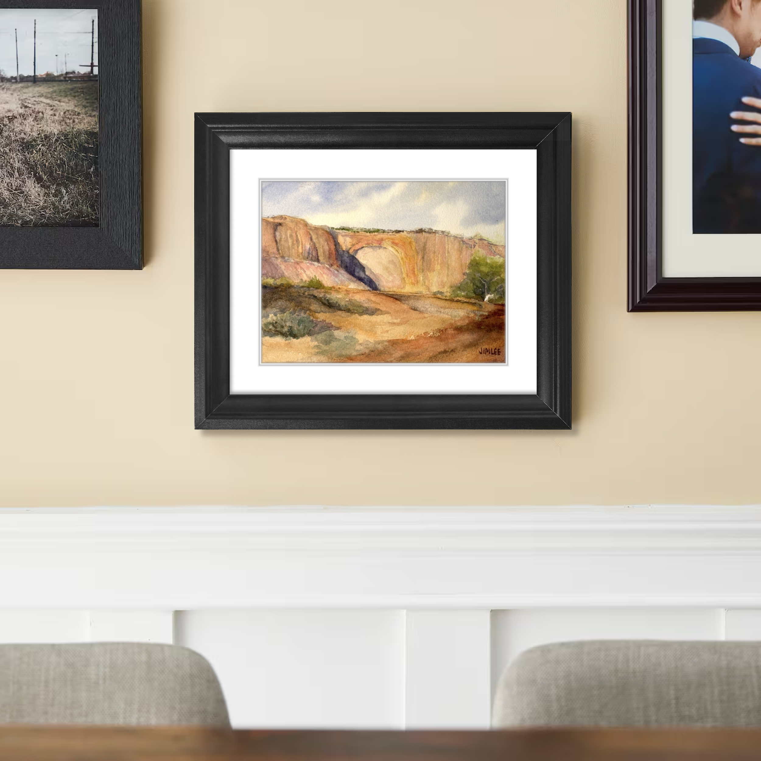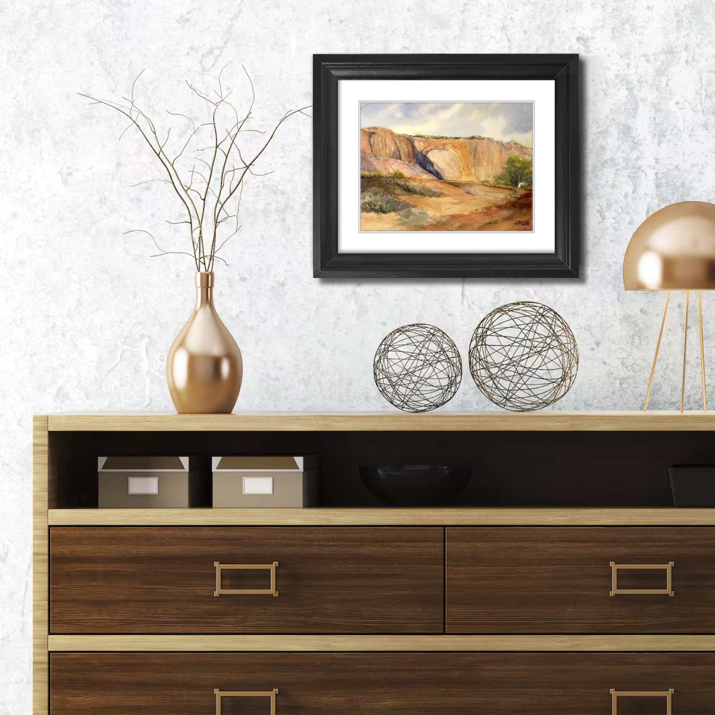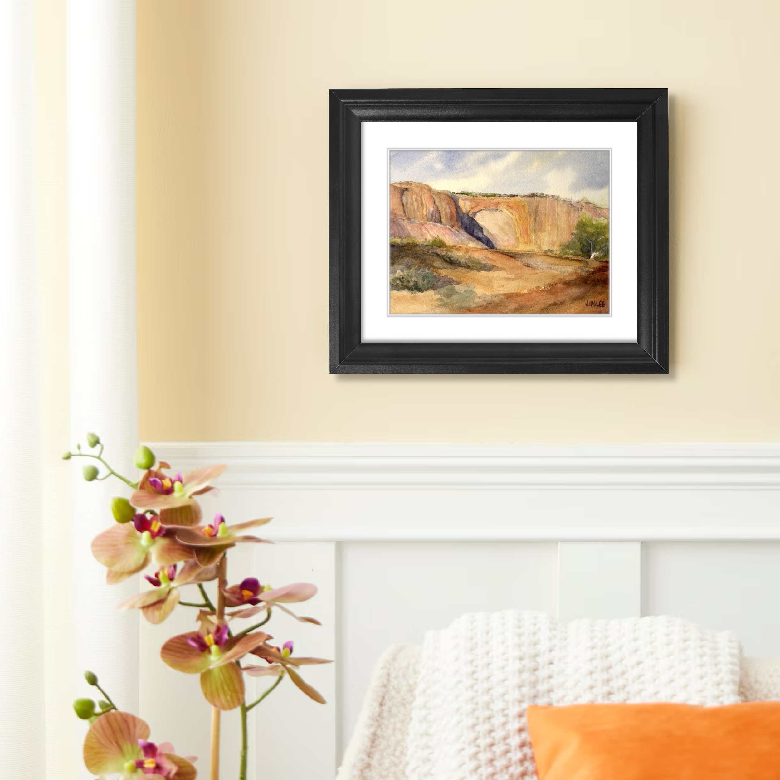 This watercolor highlights a natural sandstone arch glowing in Capitol Reef’s golden light. The rugged cliffs, painted with soft vertical striations, contrast with the gentle shadows cast by the terrain.