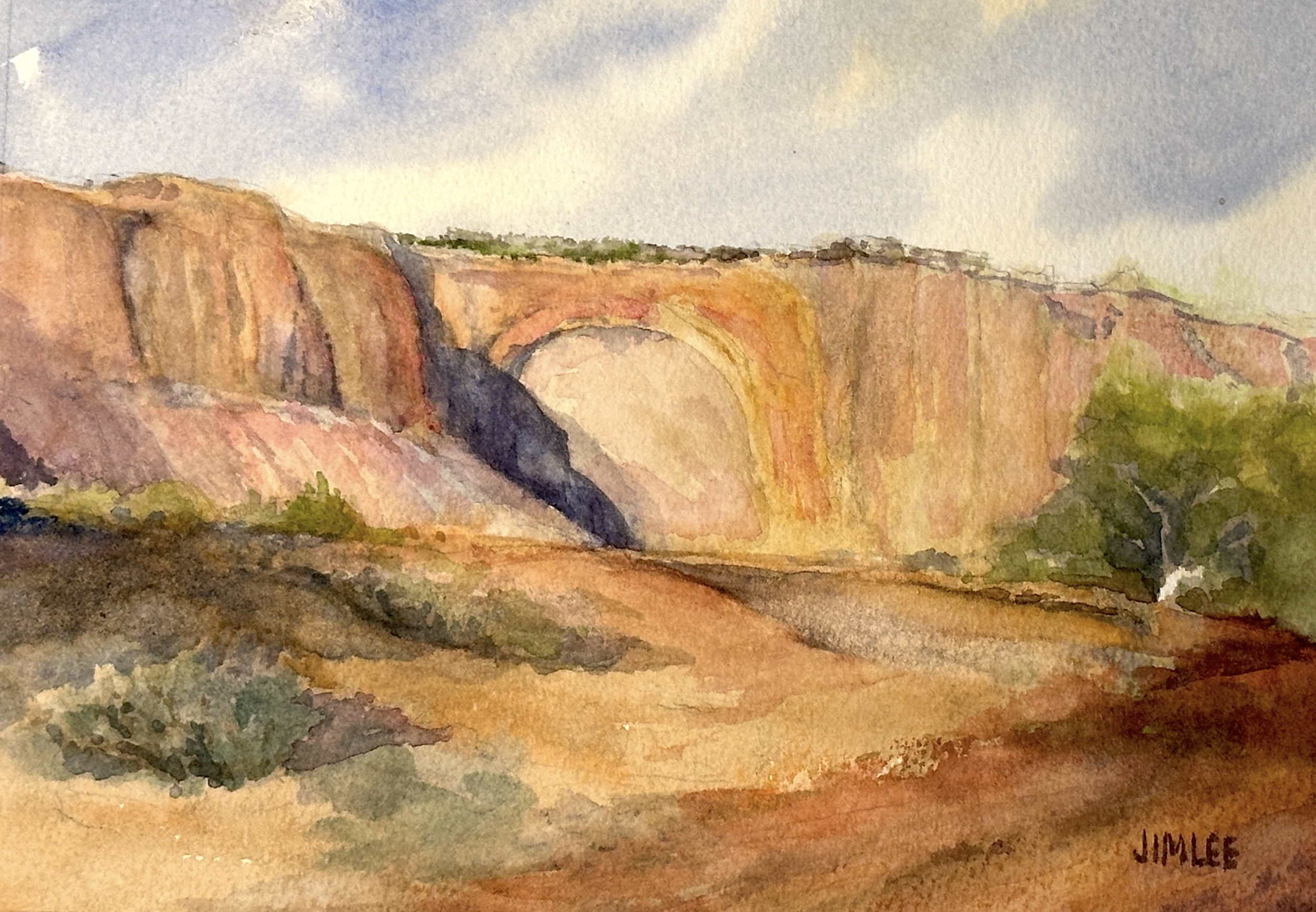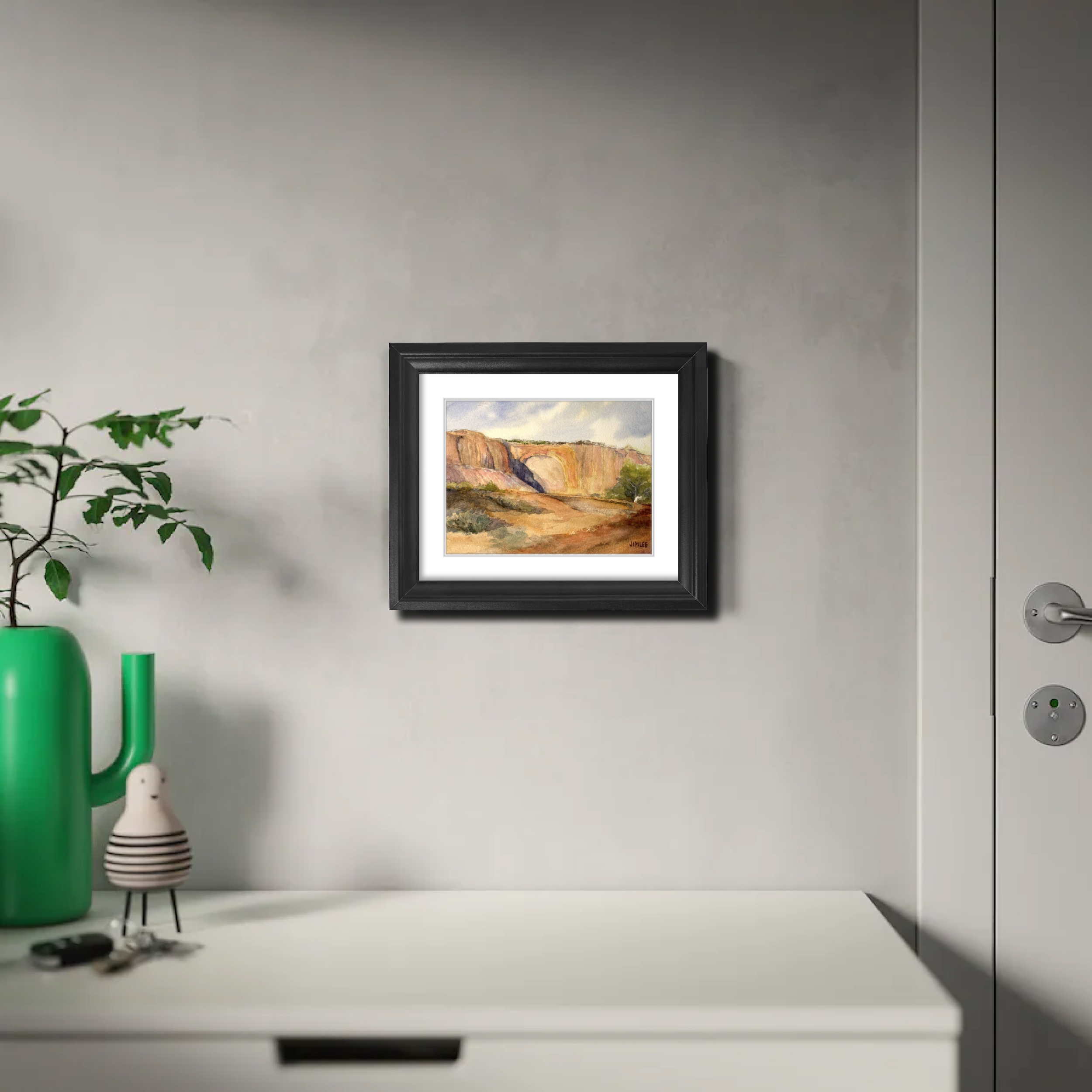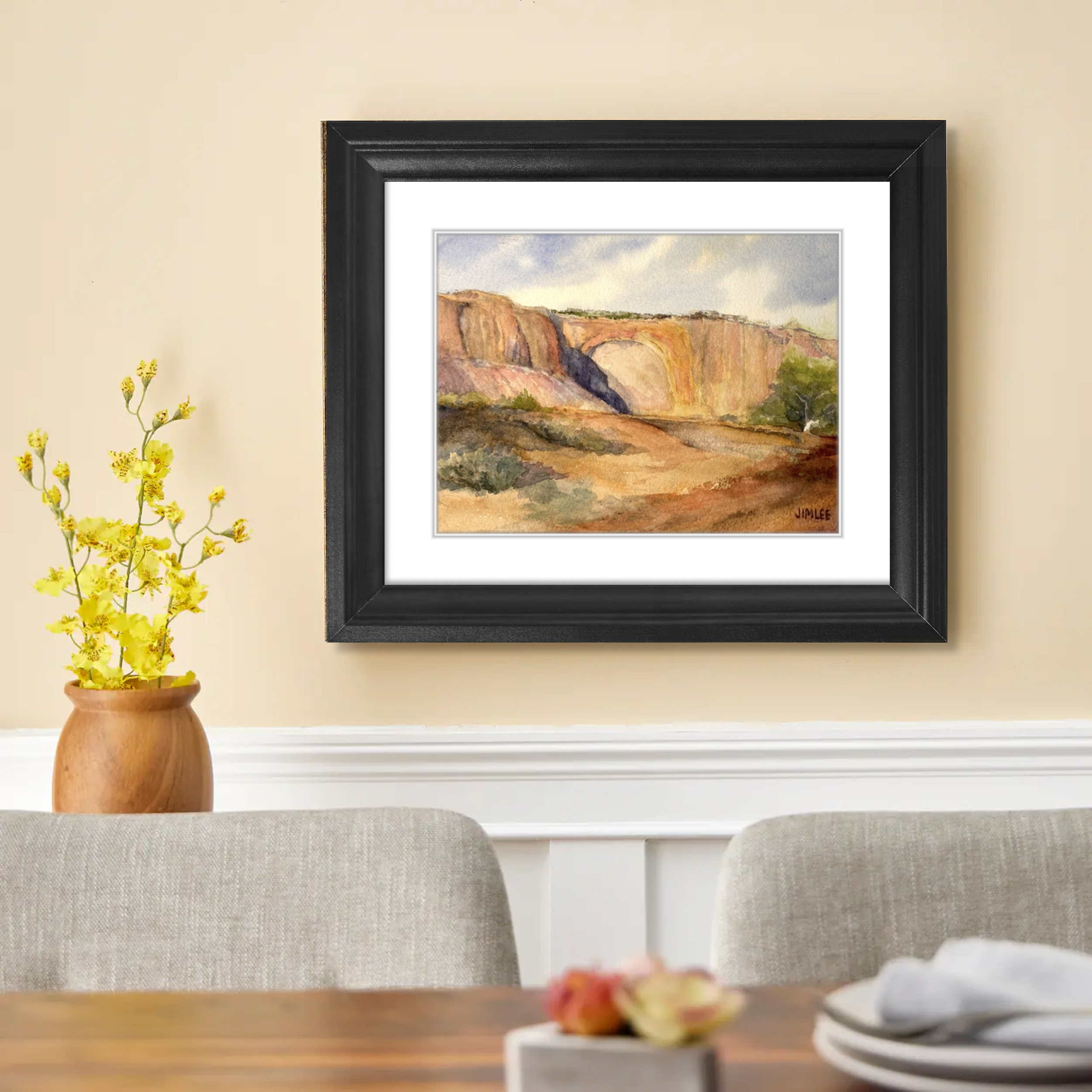 This watercolor highlights a natural sandstone arch glowing in Capitol Reef’s golden light. The rugged cliffs, painted with soft vertical striations, contrast with the gentle shadows cast by the terrain.