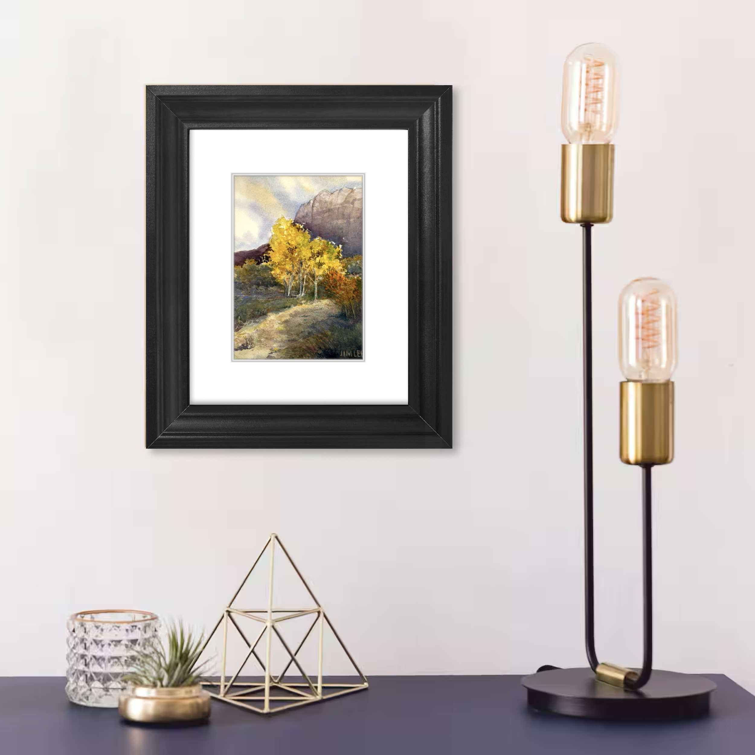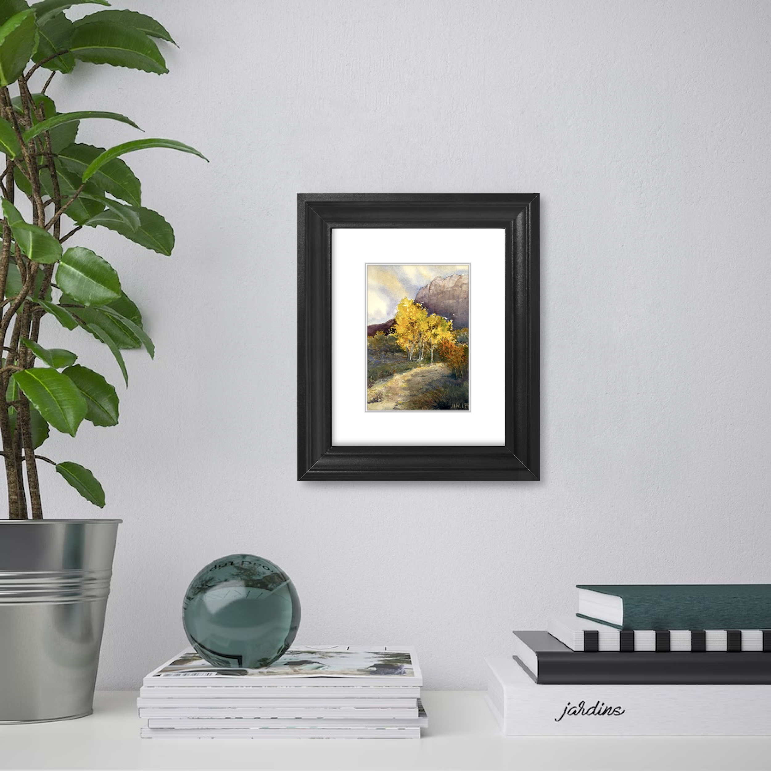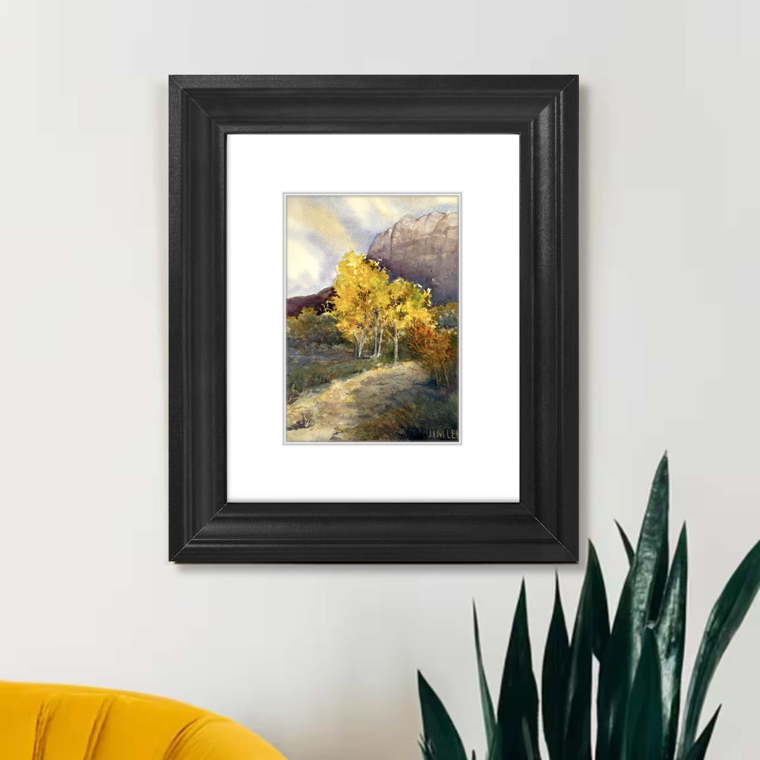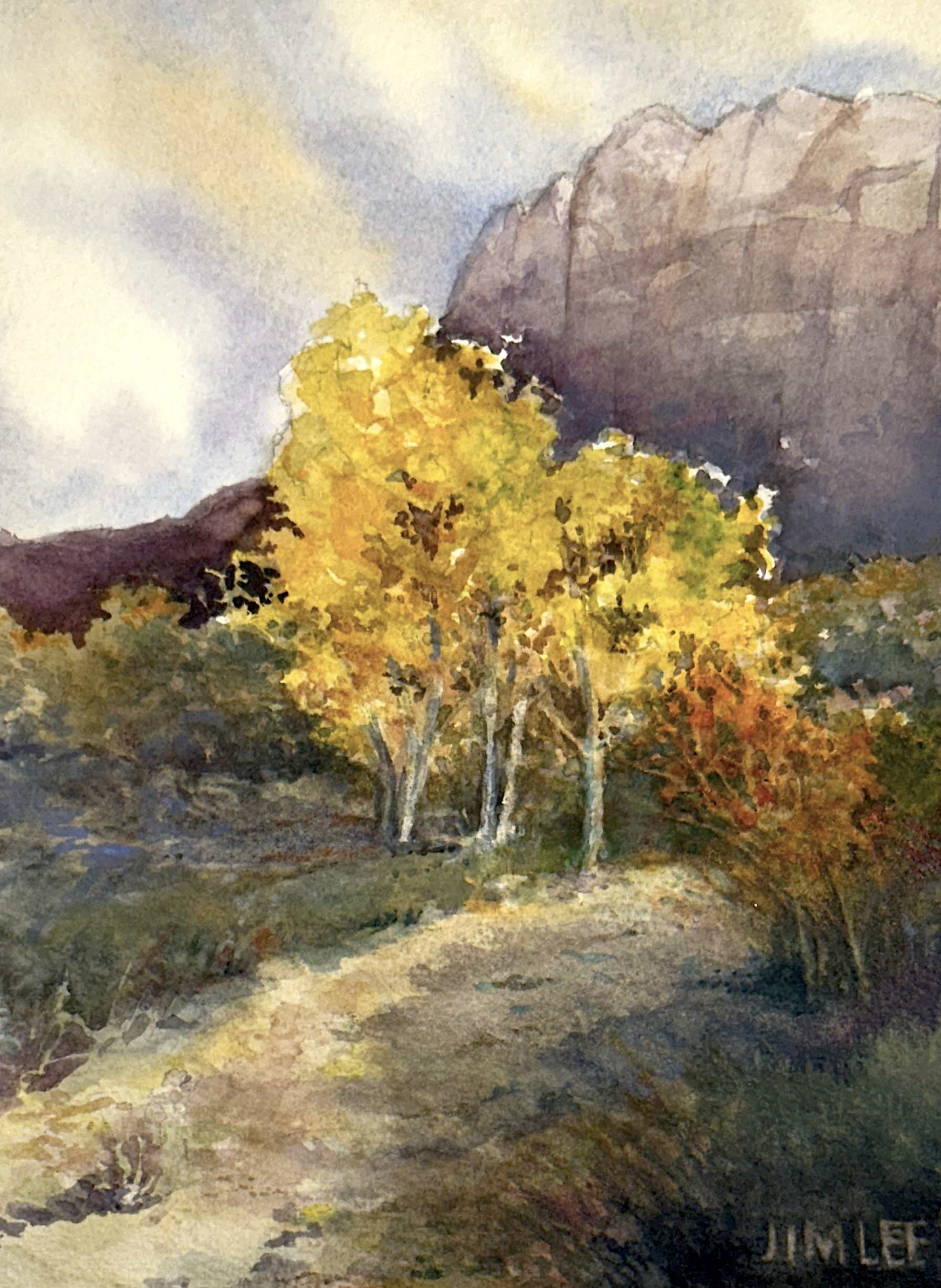 This painting showcases the vibrant fall colors of cottonwoods near a small intermittent stream in Capitol Reef National Park. Their golden hues glow against the rugged desert backdrop, creating a striking contrast with the muted tones of the surrounding landscape. The light filtering through the trees adds warmth and depth to this peaceful autumn scene.