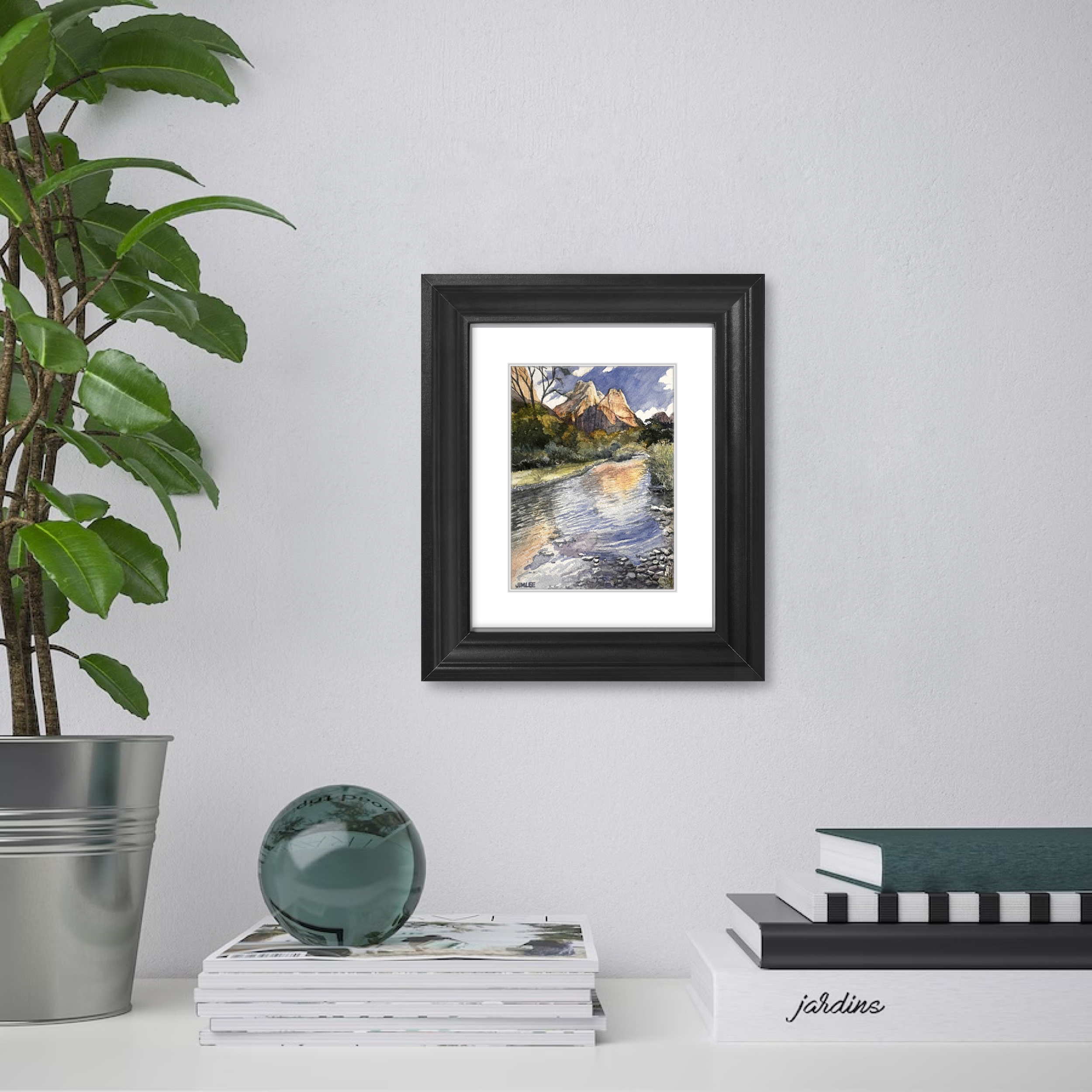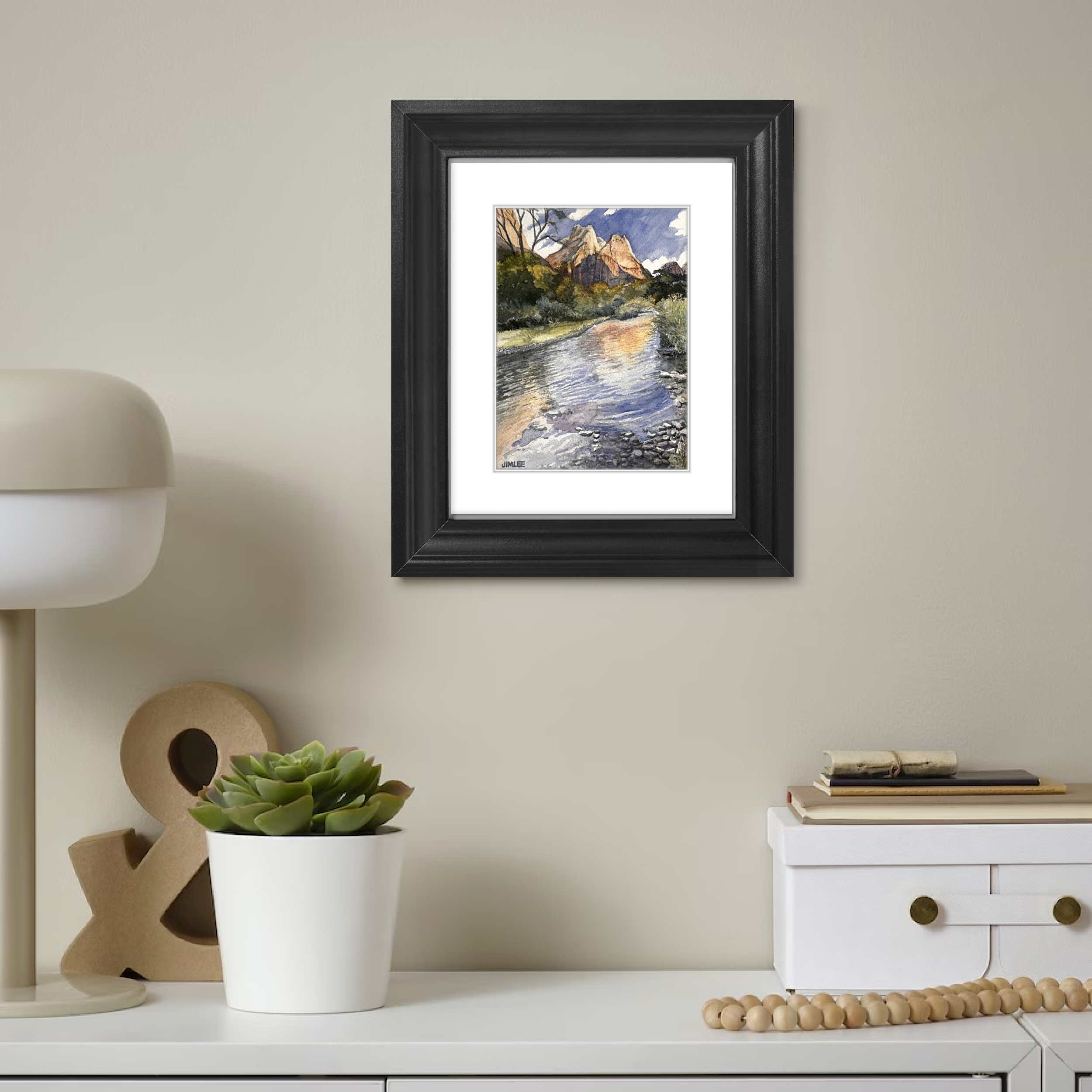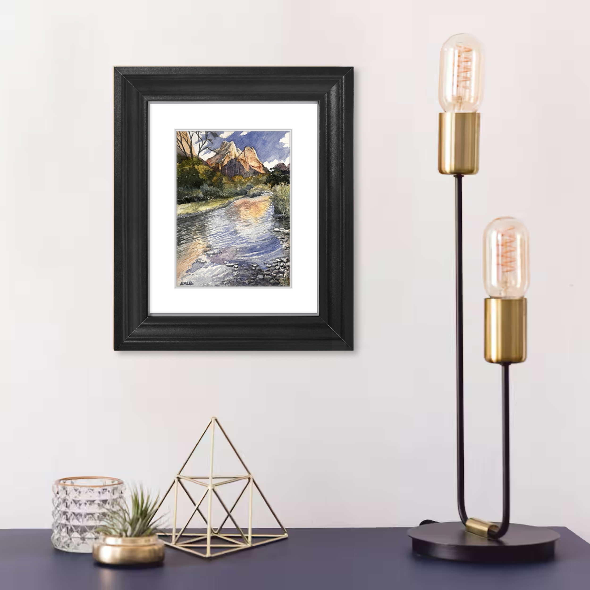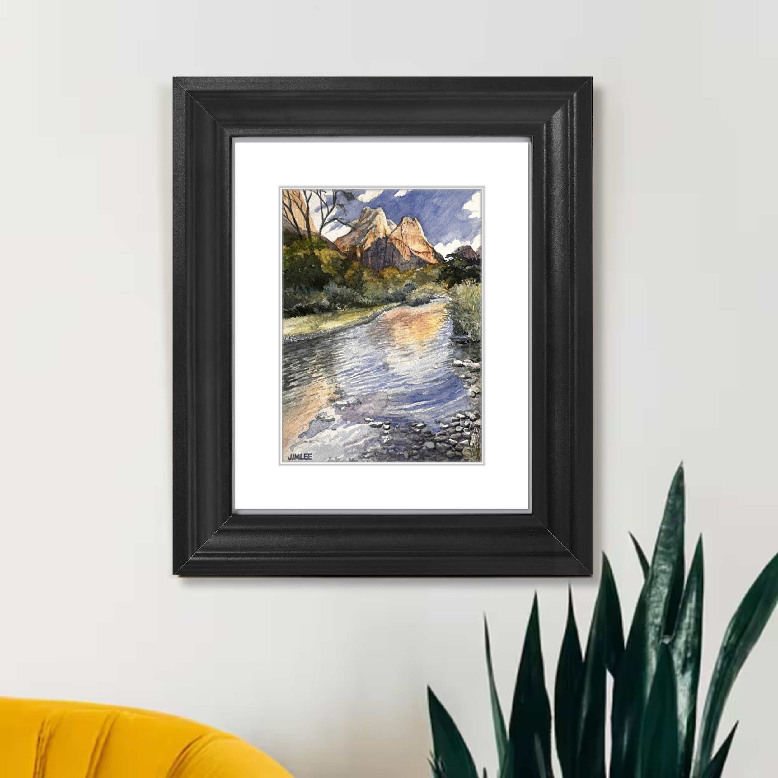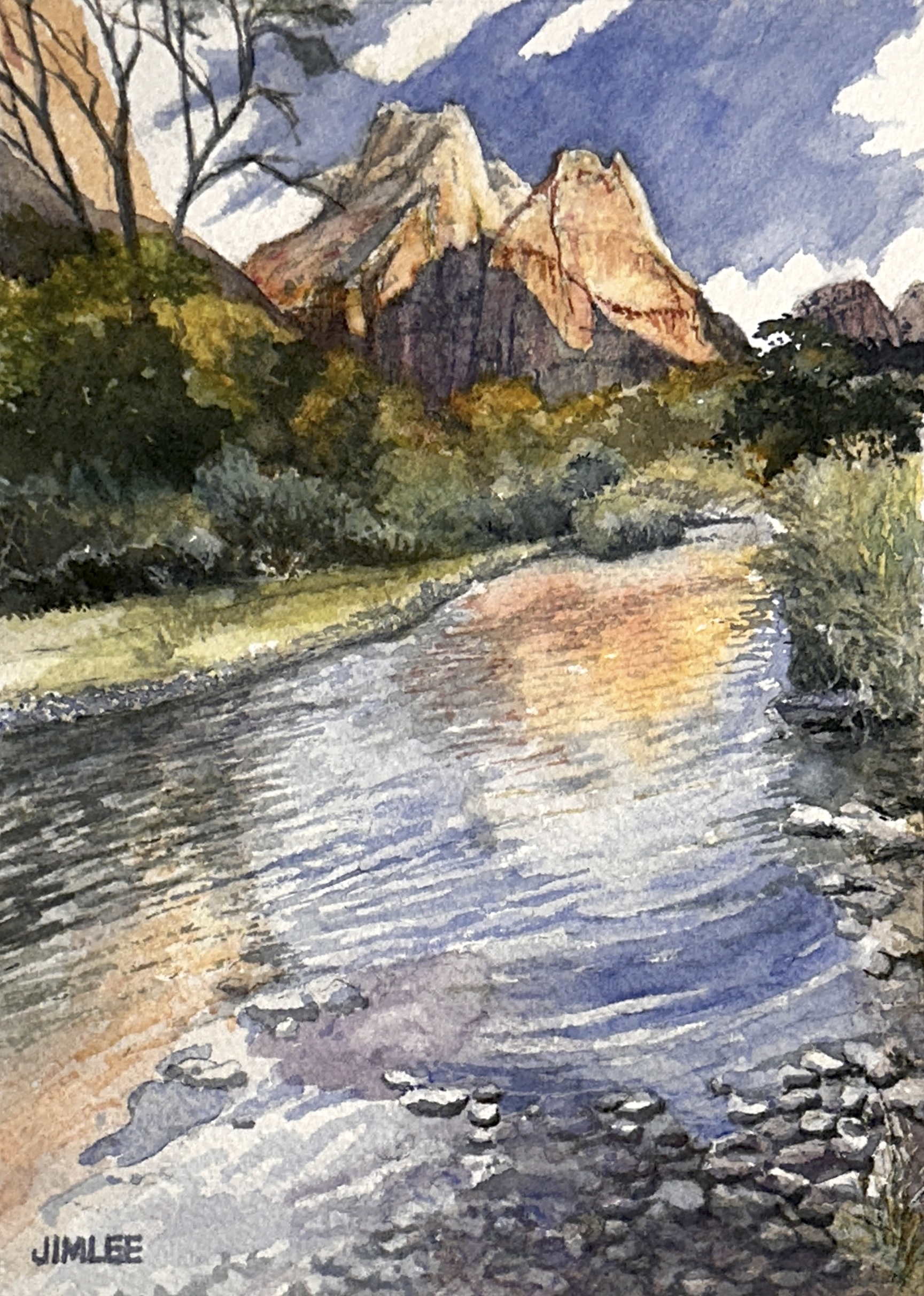 This painting features the serene Virgin River winding its way through Zion National Park, with Spearhead and Mt. Majestic illuminated in the background. The golden light on the cliffs reflects beautifully in the rippling water, creating a harmonious connection between the river and the towering sandstone peaks