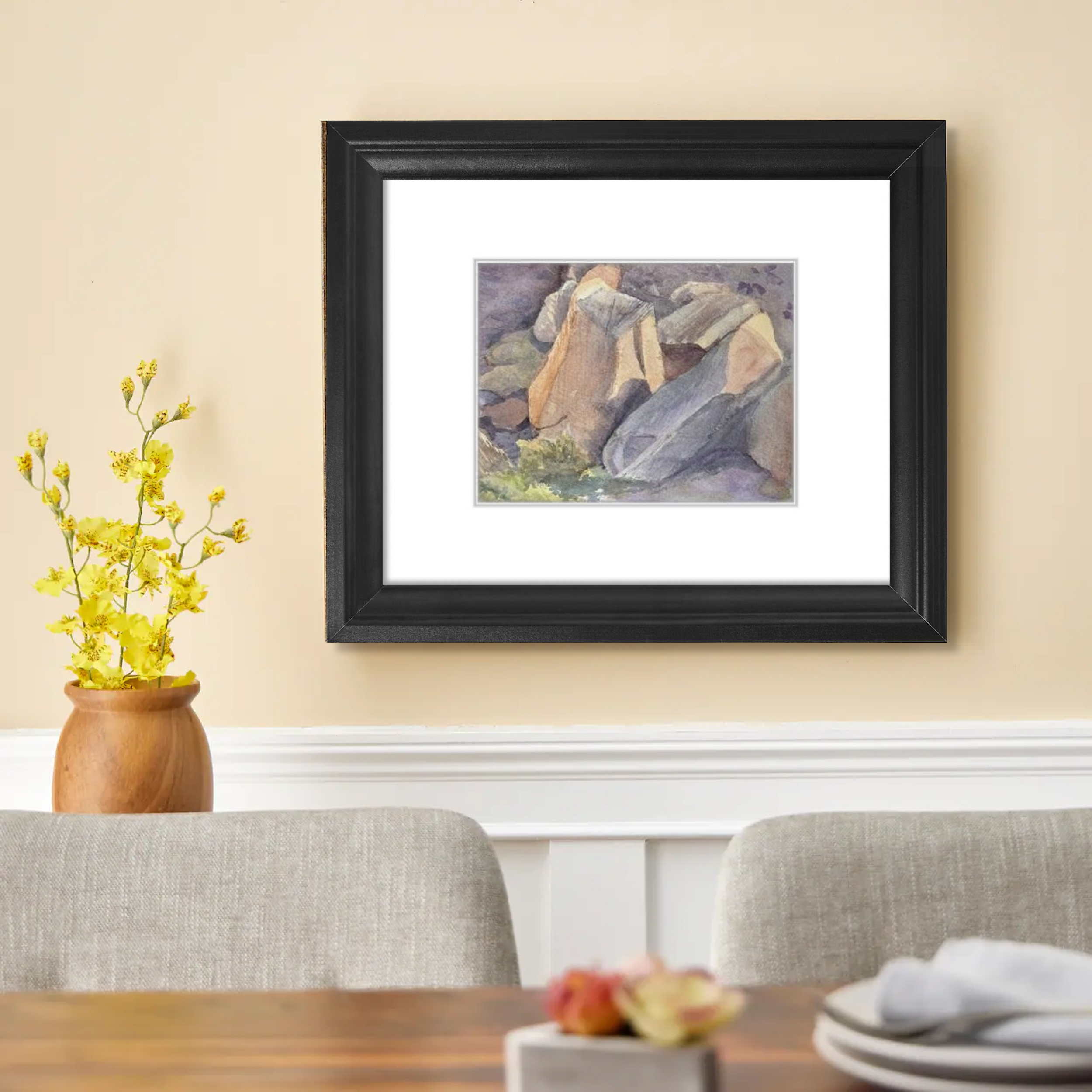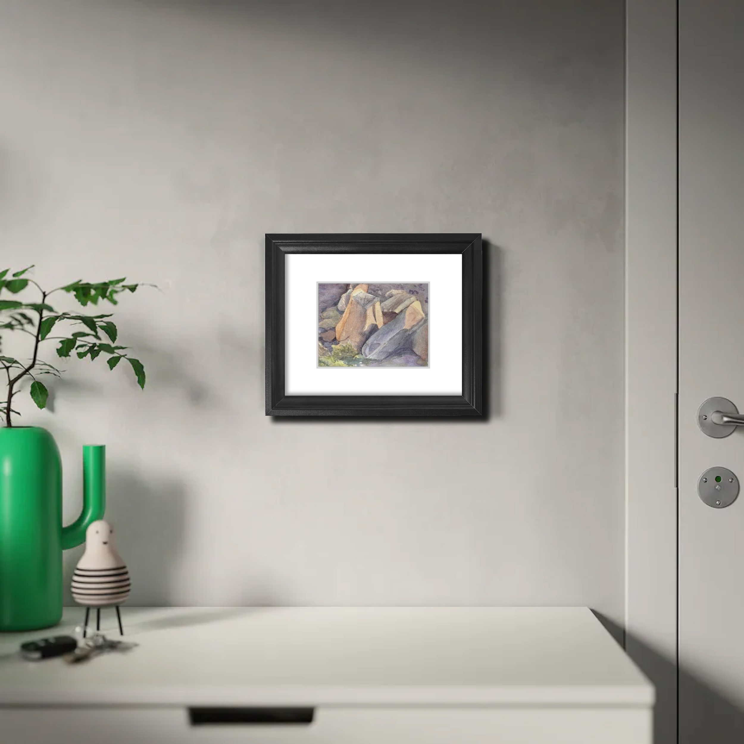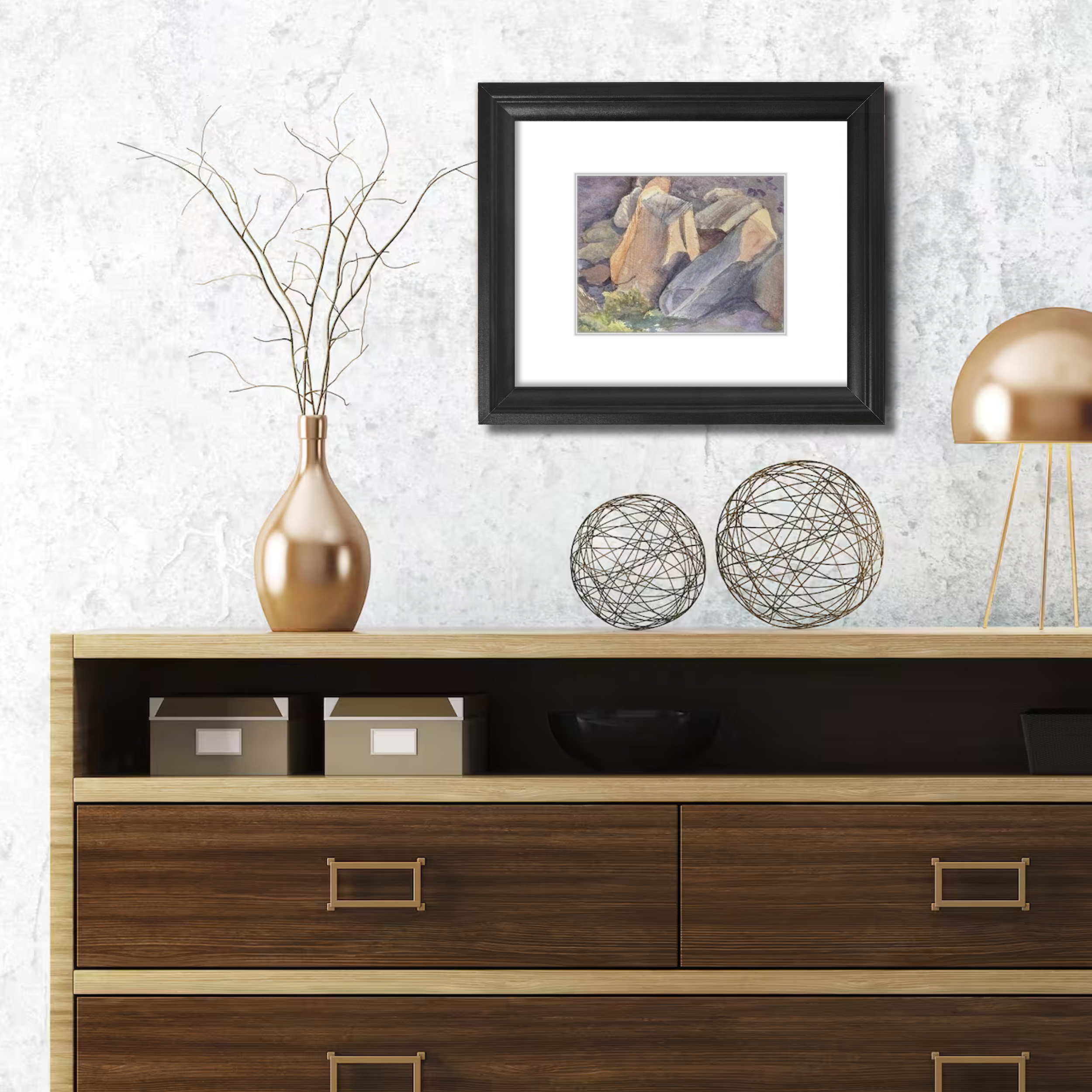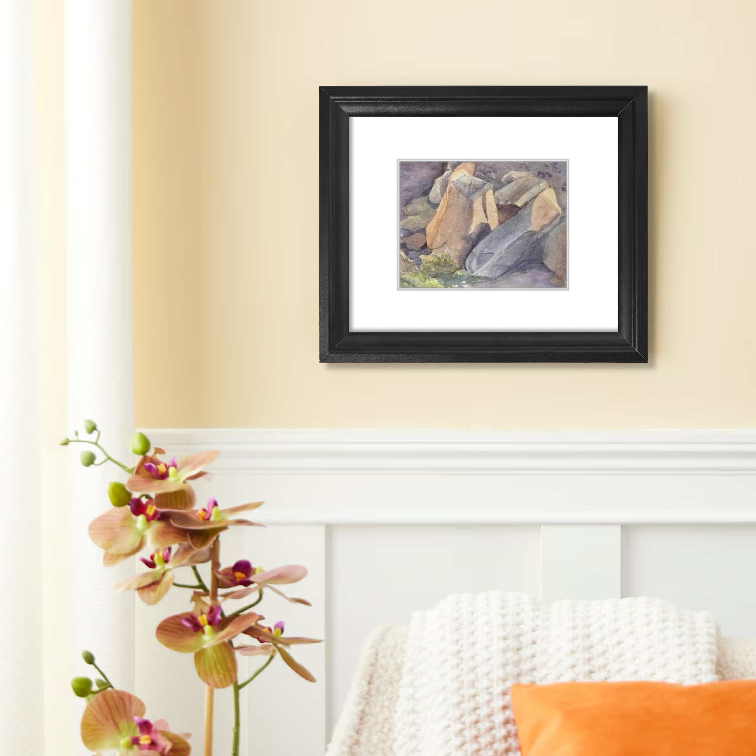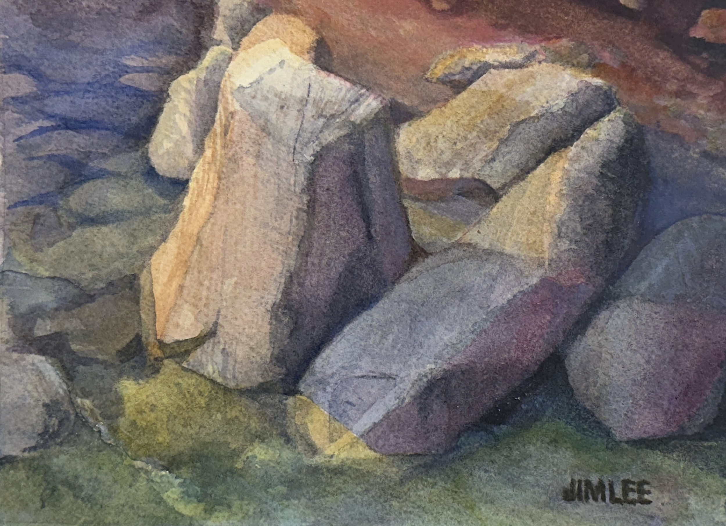 This painting captures massive rocks that have tumbled from the cliffs above, now resting in the valley where a river flows gently around them. I was drawn to the contrast of the rocks’ textured surfaces with the soft colors and movement of the water, creating a serene yet powerful scene.