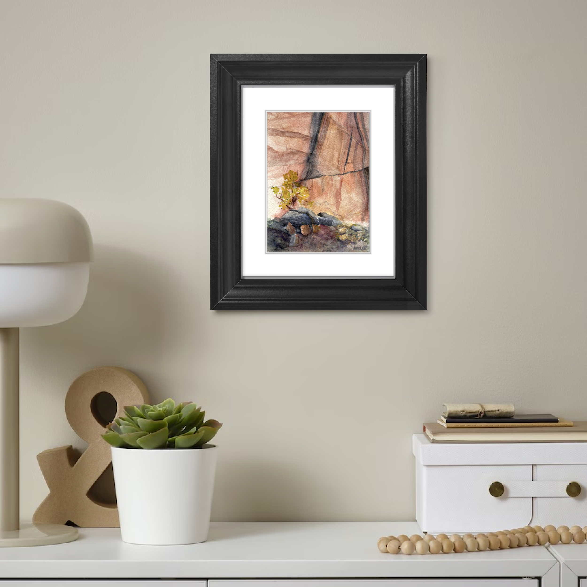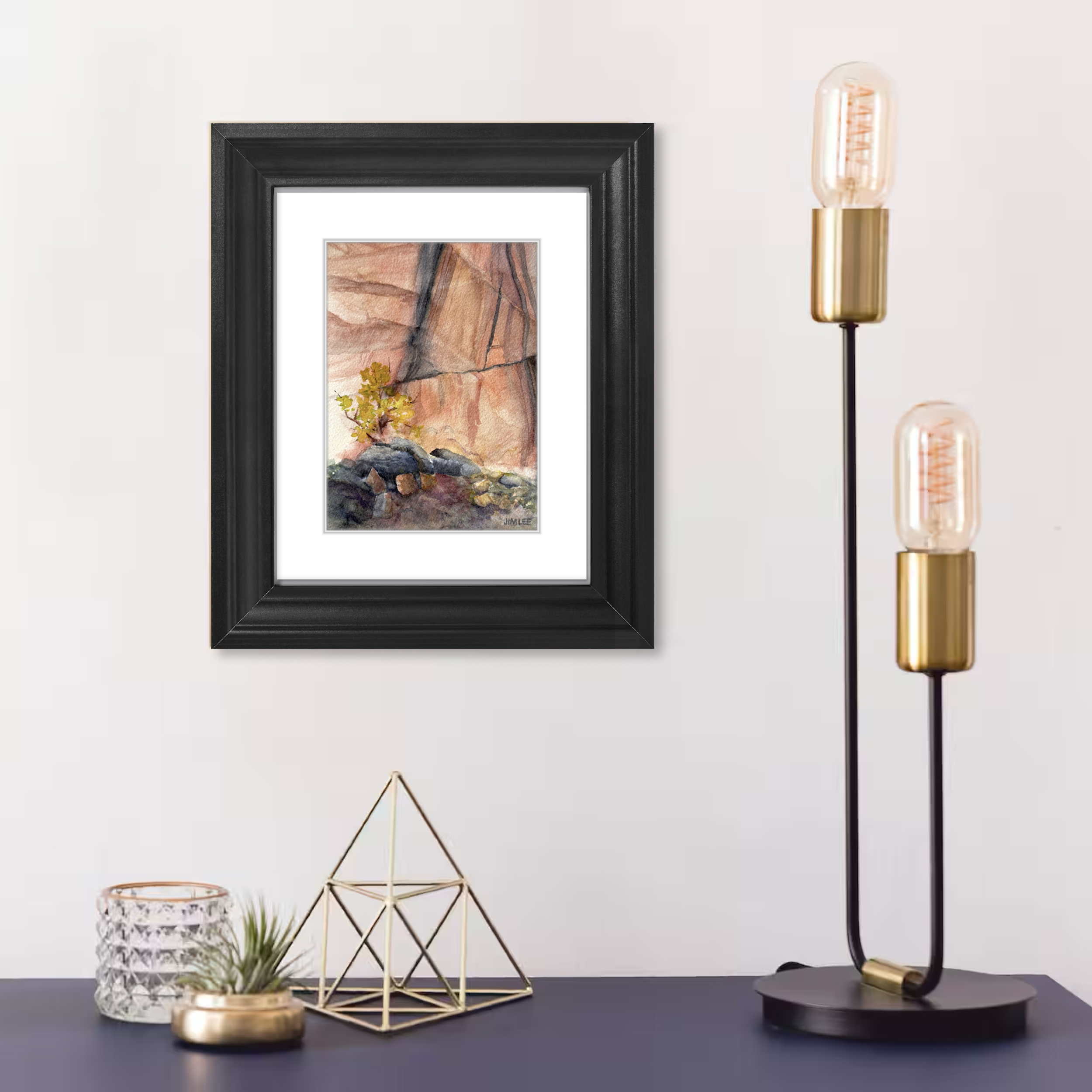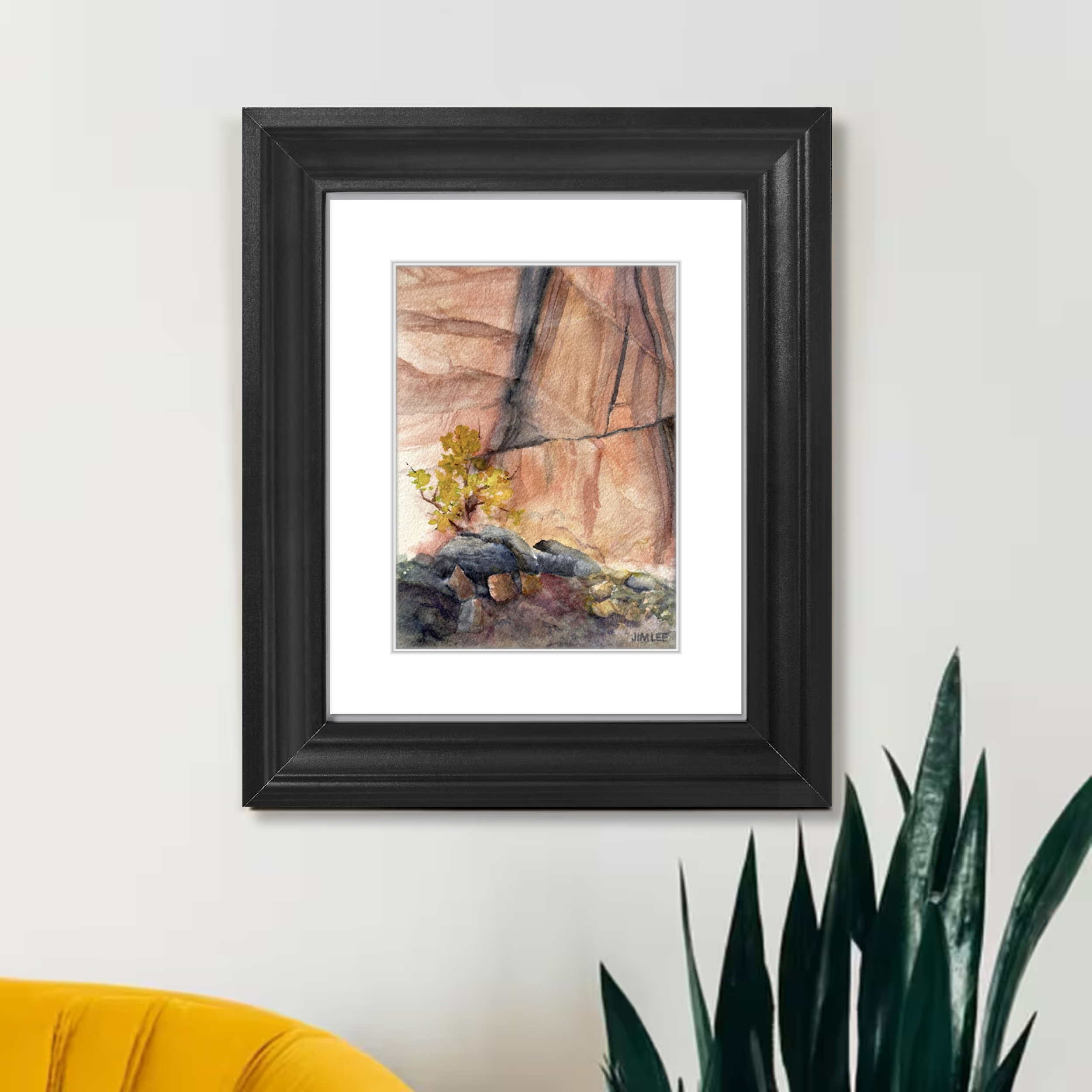 This painting showcases a vibrant yellow bush growing defiantly at the base of a towering, striped sandstone wall in Capitol Reef. The contrast between the rugged, textured rocks and the bright Fall foliage creates a striking composition, reflecting the quiet resilience of nature.